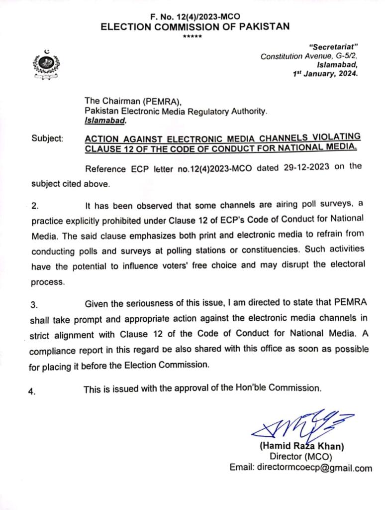 It can be clearly seen in the notification that the ban has only been communicated to PEMRA and is only applicable on TV channels and newspapers. There is no mention whatsoever of any ban on the surveys or polls themselves.