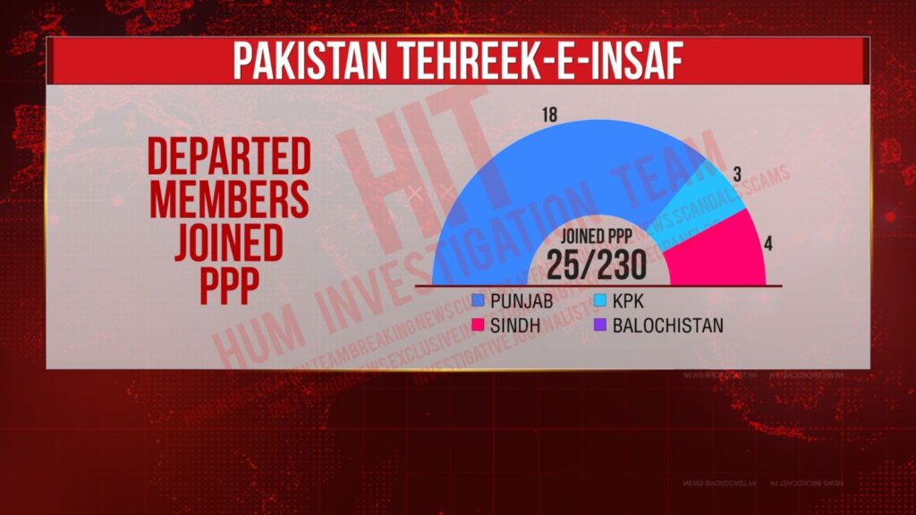 Investigations conducted by the Hum Investigation Team (HIT) revealed that about 230 MNAs and MPAs have parted ways with the PTI, constituting 61 percent of total parliamentarians. The HIT investigations stated that 210 parliamentarians, accounting for 56 percent of the total, who left PTI, have joined various political parties. The PTI parliamentarians who left the party have joined Pakistan Tehreek-e-Insaf-Parliamentarians (PTI-P), Istehkam-e-Pakistan Party (IPP), the Pakistan Muslim League-Nawaz (PML-N), the Pakistan People’s Party (PPP), Muttahida Qaumi Movement-Pakistan (MQM-P), Awami National Party (ANP), and Jamiat Ulema-e-Islam-Fazl (JUI-F).