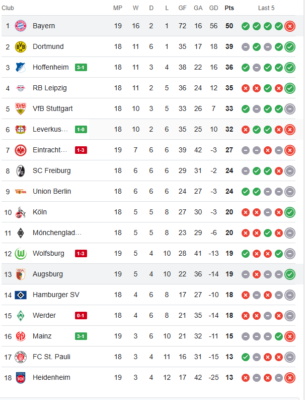 Bayern Munich topped the rankings, scoring 56 points, with Borussia Dortmund coming up with 38 points to settle in the second spot. Likewise, Hoffenheim and RB Leipzig sit in 3rd after securing 36 points in a row, with VfB Stuttgart gaining 33 points to settle in 4th in the rankings.