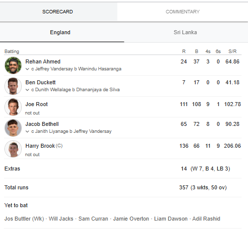 COLOMBO: The England vs Sri Lanka clash saw the touring team producing a dominant batting display to post a mammoth 357 for 3 against Lions in the third and deciding ODI clash. During their batting, the unbeaten Joe Root and Harry Brook each played havoc with their bat, scoring 111 off 108 and 136 deliveries, respectively.