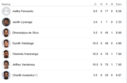 Pathum Nissanka, Avishka Fernando, Kusal Mendis (wk), Sadeera Samarawickrama, Charith Asalanka (c), Dhananjaya de Silva, Wanindu Hasaranga, Dunith Wellalage, Maheesh Theekshana, Jeffrey Vandersay, Dilshan Madushanka