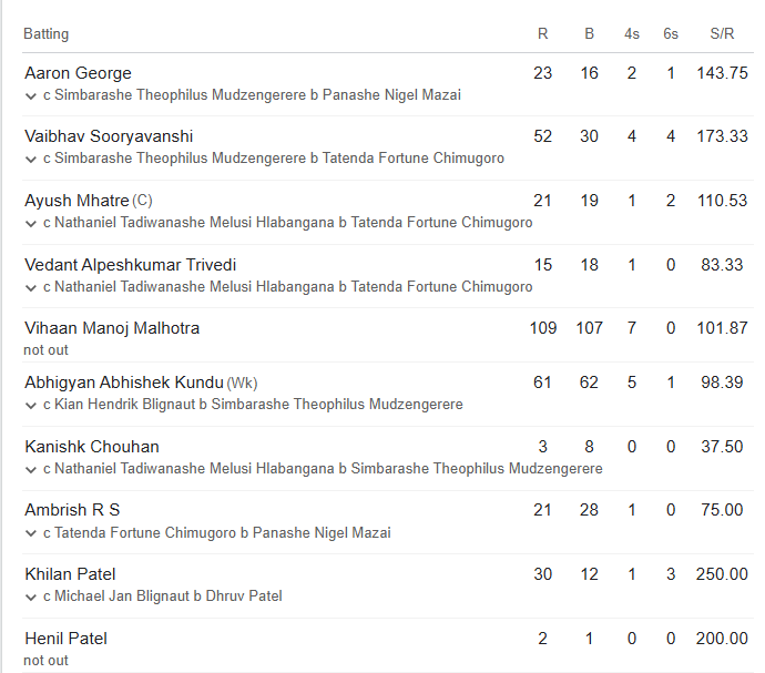 Facing a daunting chase, Zimbabwe U19 never found momentum. Their innings began disastrously when wicketkeeper Nathaniel Tadiwanashe Melusi Hlabangana was dismissed for a duck in the third over by Ambrish R S, leaving the hosts reeling at 1/1. Dhruv Patel briefly showed intent but fell for 8, and early breakthroughs allowed India to tighten their grip on the match.