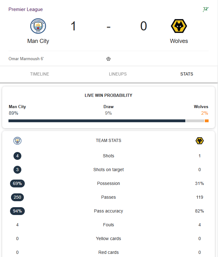 Live win probability heavily favours City at 89 per cent, reflecting their dominance on the pitch. Wolves, with just a 3 per cent chance of victory at this stage, will need to find an answer quickly if they hope to salvage a point.