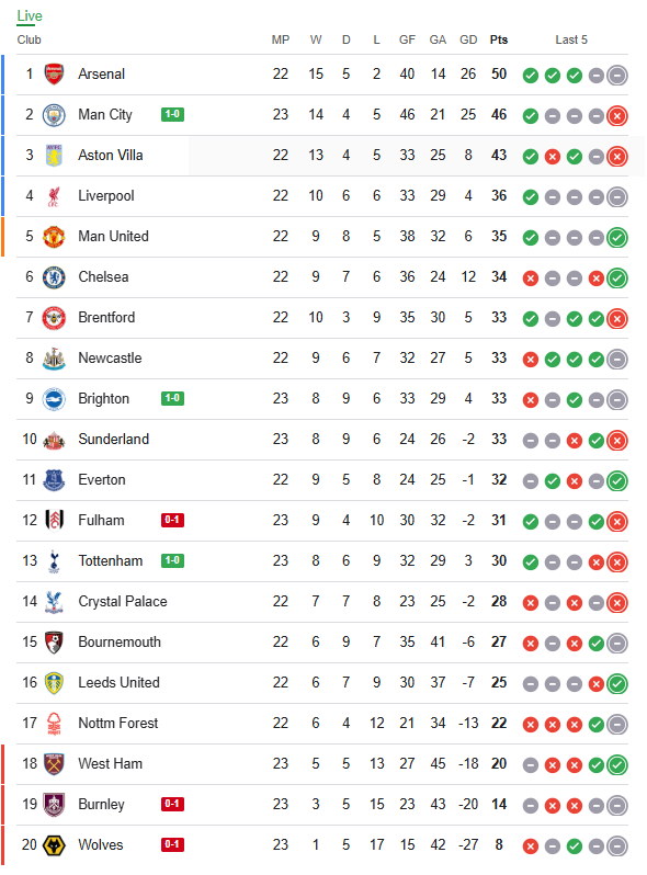 At the lower end of the table, Burnley (20 points), Wolves (20 points), and West Ham (25 points) are struggling to escape the relegation zone. Wolves, currently taking on Manchester City in tonight’s PL live clash, remain anchored in 20th place, underscoring the uphill task they face this season.