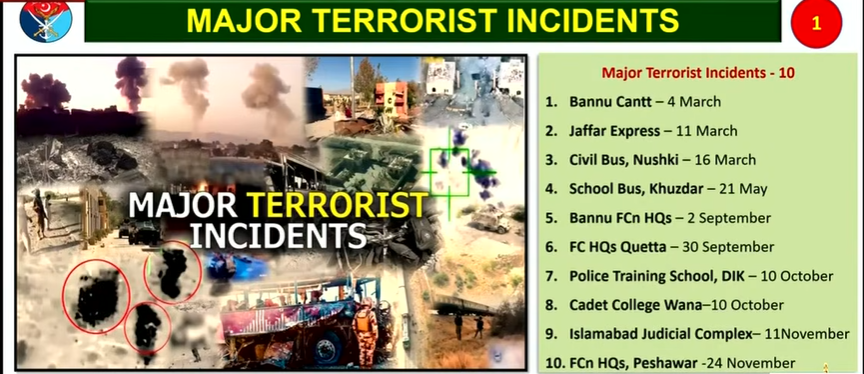 Referring to major incidents, the DG ISPR said the Jaffar Express attack and the attempted assault on Wana Cadet College highlighted the persistent threat posed by militants. He said all terrorists involved in the Wana attack were neutralised, though four soldiers were martyred. He added that terrorists had remained in contact with facilitators outside Pakistan and that their hideouts in Afghanistan were destroyed within hours.
