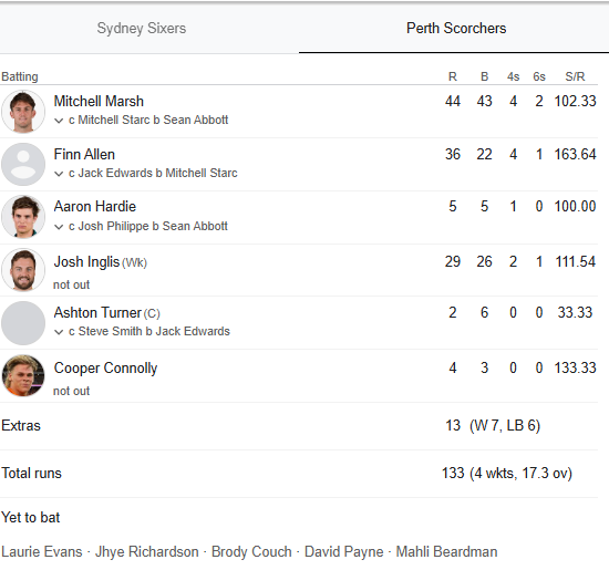 After brief hiccups in the middle order, Josh Inglis ensured there were no late surprises, remaining unbeaten on 29 off 26 balls, while Cooper Connolly (4*) stayed with him to finish the game calmly. Sydney’s bowlers tried to claw their way back, but the modest target and lack of pressure runs made the task difficult. The Scorchers’ chase never dipped out of control, underlining their dominance in the contest.