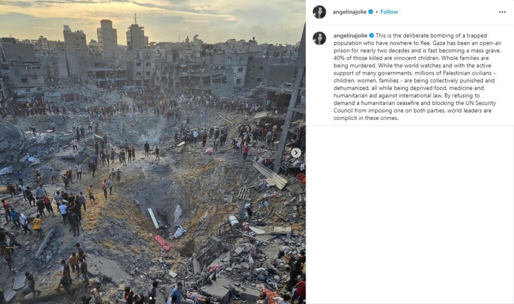 Angelina highlighted the urgent need for a ceasefire and pointed out that world leaders bear responsibility by failing to prevent these tragic events.