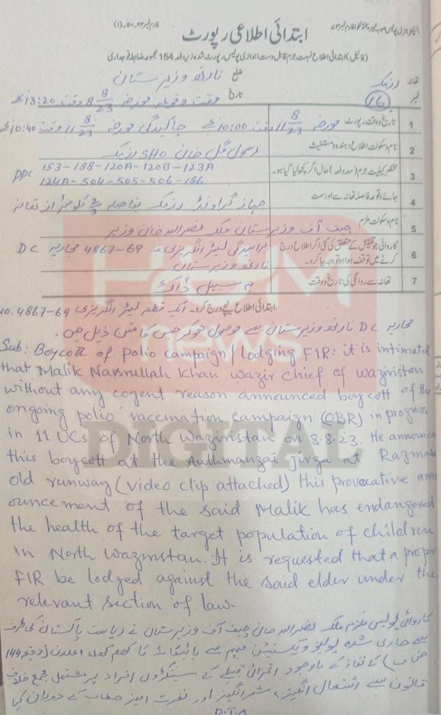 The jirga is not the only controversial initiative of Malik Nasrullah. An FIR was also lodged against him for obstructing a polio campaign. It stated that, “without clear justification, he declared a boycott of the ongoing polio vaccination drive in 11 Union Councils on August 8”, thus imperilling the health of thousands of children in the district.