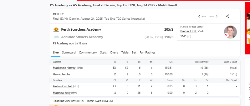 In reply, Adelaide Strikers fell short despite a spirited effort, finishing at 190-6 in their 20 overs. After losing opener Jake Winter (1) in the second over, Mackenzie Harvey and Harry Manenti stitched together a rapid partnership that lifted hopes for their side.